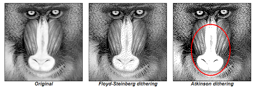 Atkinson Dithering은 Apple 출신 개발자 Atkinson이 개발한 디더링이다. 모든 weight를 더하면 6/8이고 1이 되지않아서 데이터의 손실이 발생한다. 위의 그림에서 원숭이의 코 부분(빨간색 원)에 Data가 씻겨져나간 것을 볼 수 있다. 하지만, 장점도 있다. 밝은 곳과 어두운 곳의 더 뚜렷한 대비를 얻을 수 있다. 또 weight가 모두 1/8이기때문에 HDL로 설계 시 적은 Gate를 사용하여 설계할 수 있다.