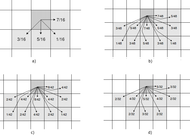 현재 픽셀에서 발생하는 에러(오차)를 오른쪽으로 7/16, 왼쪽 아래로 3/16, 아래쪽으로 5/16, 오른쪽 아래로 1/16를 곱하여 전달한다. 이때 곱해지는 Weight의 합이 1이되는 것이 중요하다. 1보다 작다면 데이터의 손실을 의미하고, 많다면 의미없는 값이 추가되어 영상 데이터가 더 밝아지게 되는것을 의미한다.