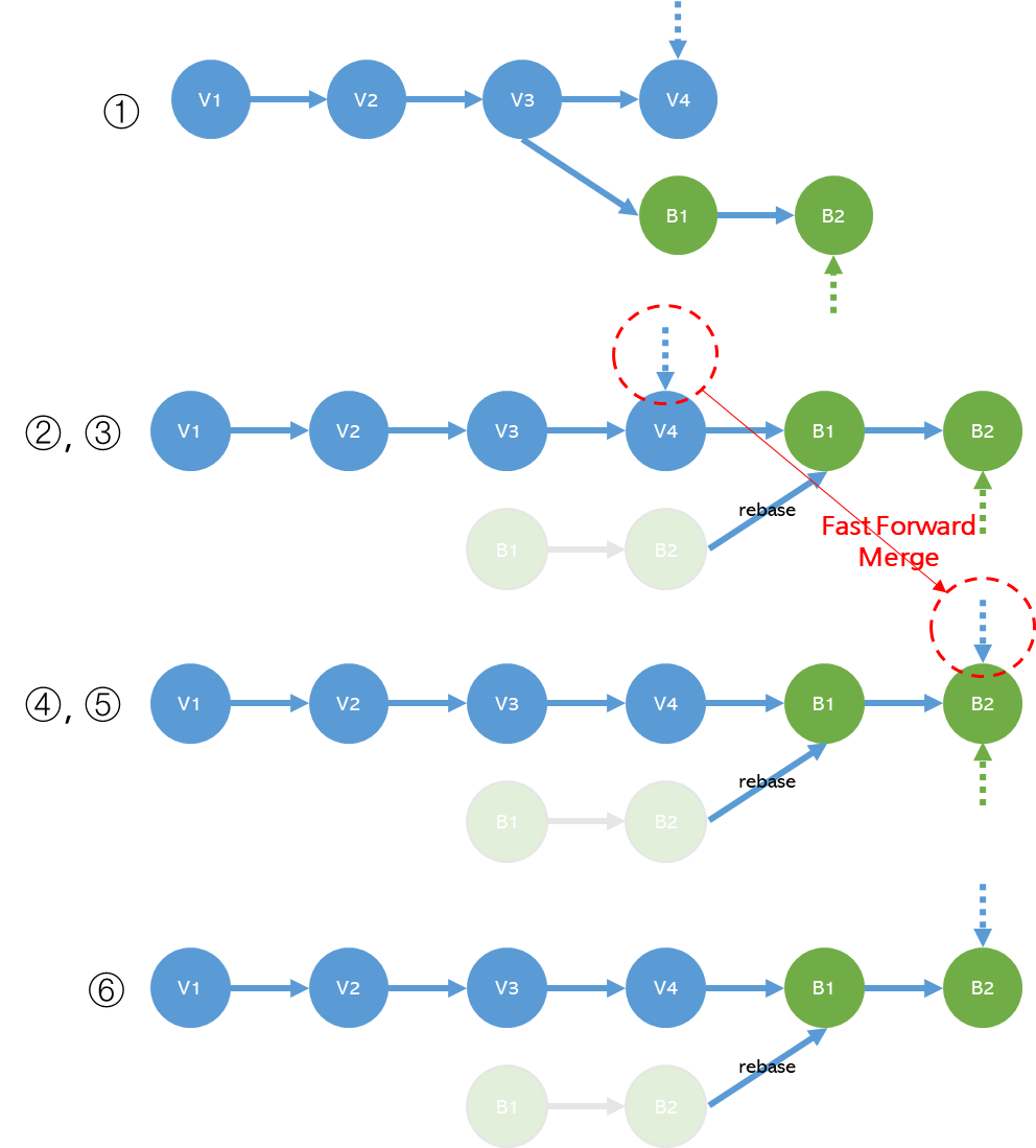 • Rebase로 Branch를 합치는 경우, Fast Forward Merge를 해야한다.