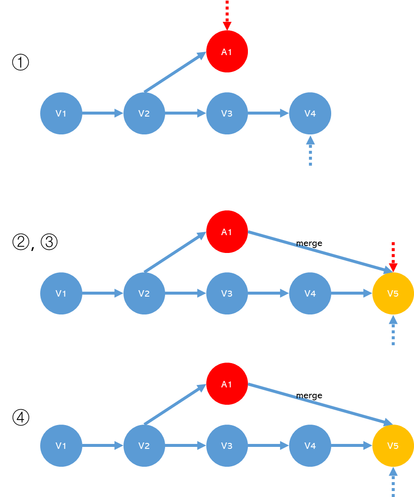 ③HEAD가 가리키는 Commit에 해당 Branch가 가리키는 Commit을 합쳐 새로운 Commit을 만든다.