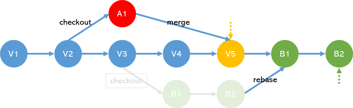 • A 브랜치에서 다른 B 브랜치를 Merge 할 때 B 브랜치가 A 브랜치 이후의 커밋을 가리키고 있으면(즉, B 브랜치가 A 브랜치를 기반으로 하면), A 브랜치가 B 브랜치와 동일한 커밋을 가리키도록 이동시키며 어떠한 Commit도 만들지 않는다.