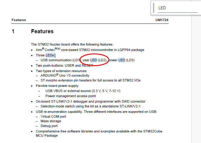보드메뉴얼을 읽어보면, user LED가 LD2라는 이름인걸 알 수 있다.