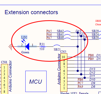 회로도를 보면, LED2가 D13 커넥터를 지나서 PA5 핀과 연결된다.