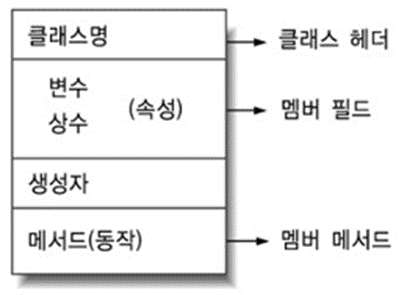 클래스가 포함하는 데이터형 들의 집합을 멤버 변수(속성)라고 하며, 함수를 멤버 메서드(행위, 동작)라고 한다. 생성자는 클래스로부터 객체가 생성될 때 객체의 초기화 과정을 기술하는 특수한 메소드이며 객체가 생성될 때 무조건 수행된다.