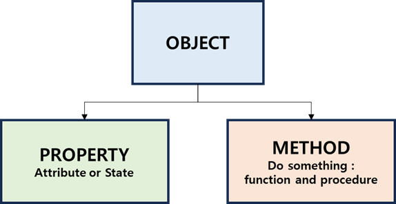 OOP는 컴퓨터 프로그램을 명령어의 나열로 보는 것이 아닌, 여러 개의 독립된 단위, 즉 객체(Object)로 보는 것이다. 객체는 실제 사물을 프로그램으로 가져와 모델링하는 것으로 속성(Property)과 행위(Method)가 있다. 속성은 객체의 상태, 성질 등을 의미하고, 행위는 기능이나 연산을 의미한다.