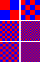 위의 그림은 공간적 디더링인데, 빨간색과 파란색 두 픽셀의 중간값(보라색)으로 착시를 일으킨다.