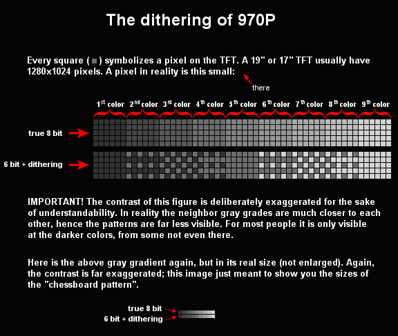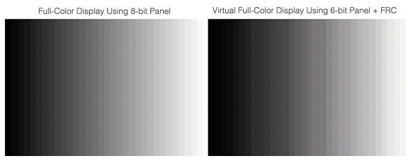따라서 실제 8Bit와 6Bit + FRC는 분명히 다르고, 8Bit가 훨씬 매끄럽다. 하지만 TV나 모니터에서 나오는 영상데이터의 주사율이 매우 빨라서 착시현상을 일으켜 우리가 실제로 느끼기는 힘들다.