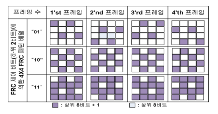 FRC를 적용해보자. 영상데이터가 10101001(10진수로 169)이 들어오면 하위 2개의 Bit가 01이다. 이 '01' 데이터를 다음 4번째 프레임까지 들어오는 Pixel 데이터에 1씩 더하여 출력한다(위 그림에서 보라색). 총 16개의 픽셀 중에 4개만 1을 더해주고, 이것을 총 4프레임 동안하면 4/16(상위 8비트 + 1) * 4(Frame) = 1이 되어서 Error를 손실없이 처리할 수 있다.